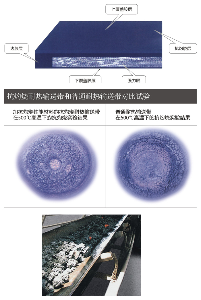产品特点:本产品与普通耐热输送带相比具有优良的抗灼烧性能,在高温状态下胶带表面可迅速形成致密碳化层而达到抗灼烧的效果,起到延长和提高使用寿命的目的,适用于温度较高(如烧结矿、水泥矿等)的特殊输送场所。